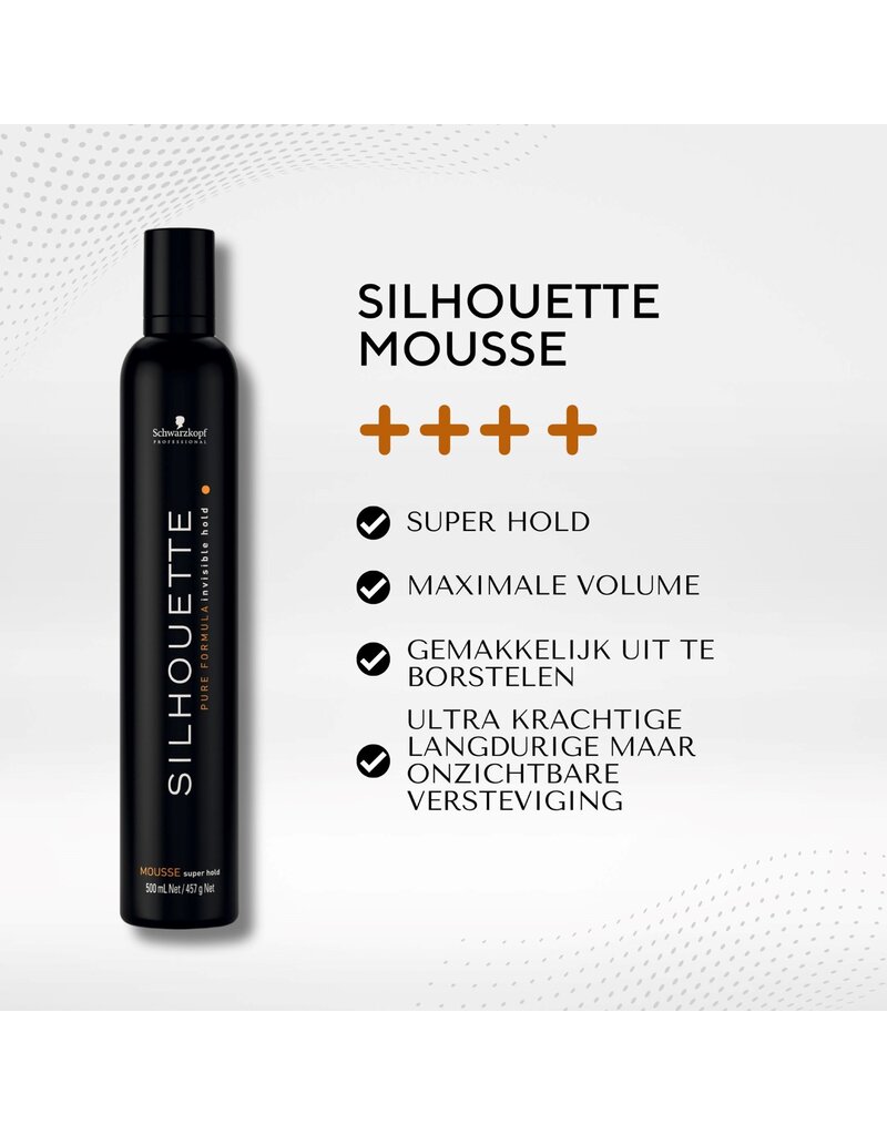 Schwarzkopf Silhouette Super Hold is dé haarmousse met een formule voor kleurcoderingen en is speciaal ontwikkeld voor föhn- en watergolftechnieken. Het schuim legt een zacht micro laagje rond het haar voor maximaal volume met een langdurig resultaat, zonder dat het haar belast of wordt verzwaard. Silhouette Super Hold Mousse modelleert en fixeert gemakkelijk. Spuit de foam in je handen, gebruik een kleine hoeveelheid (ter grote van een walnoot), kneed in het haar en creëer de juiste coupe. Dit haarstylingsproduct droogt snel, plakt niet en is gemakkelijk met de borstel te verwijderen.